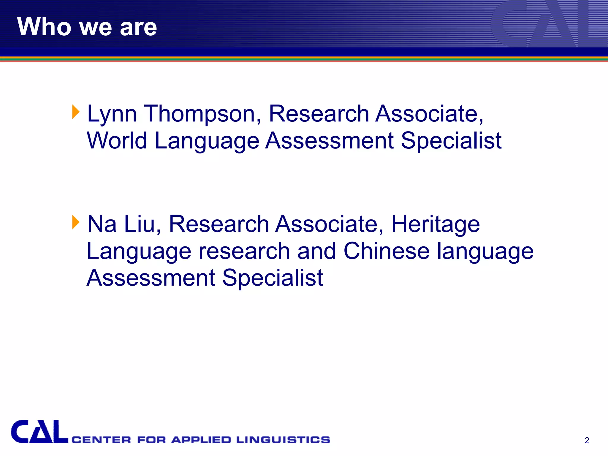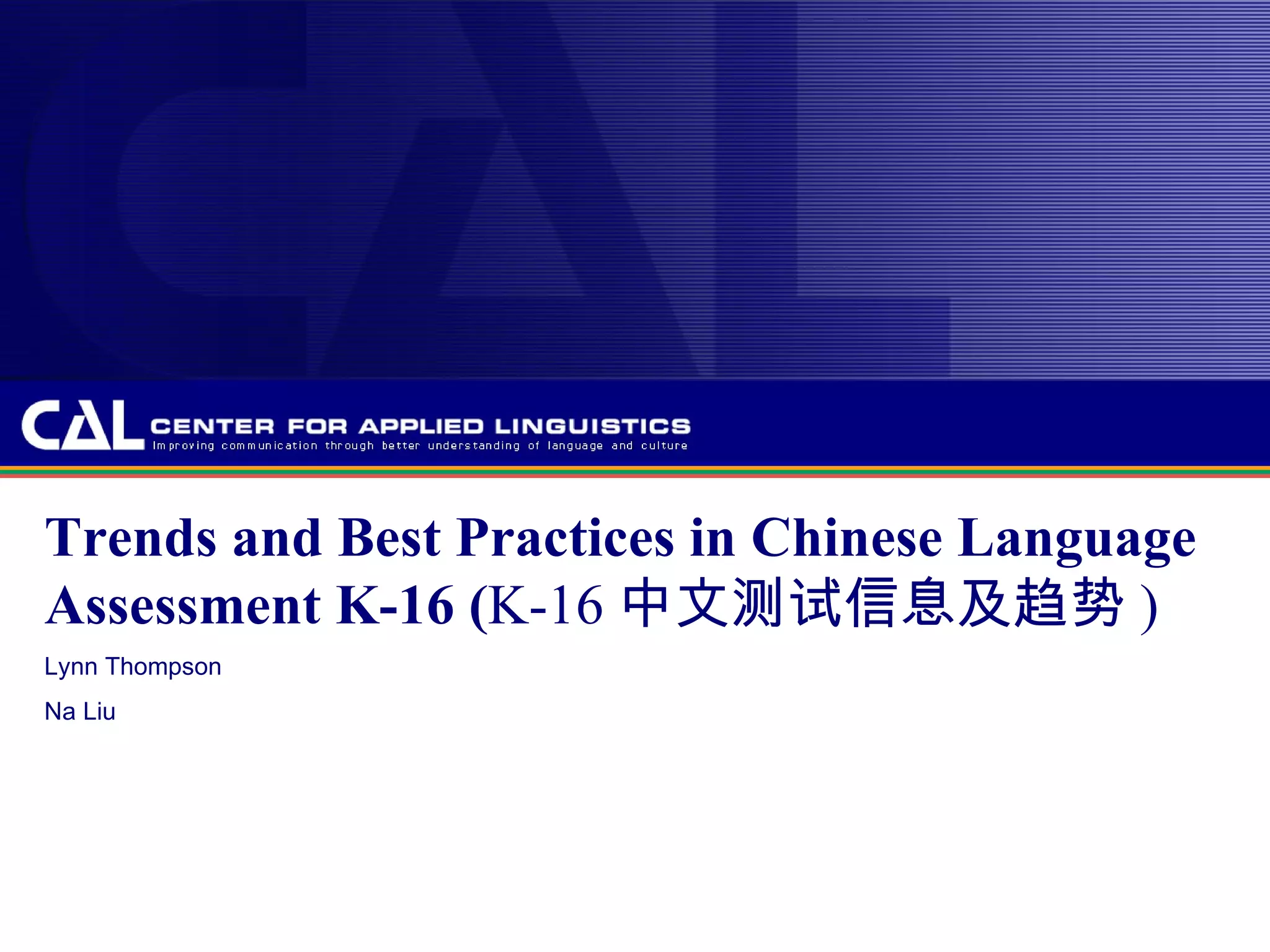 This document provides an overview of trends and best practices in Chinese language assessment for K-16 education. It introduces the Center for Applied Linguistics and its mission to improve language understanding through research. Various types of language assessments are defined, including formative and summative assessments. Innovative assessment resources for K-16 students from CAL are described, such as the Foreign Language Assessment Directory, Understanding Assessment guide, and K-8 assessments like ELLOPA, SOPA, and COPE. Additional resources for 9-16 students including the Computerized Oral Proficiency Instrument and rater training materials are also covered.