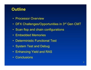 The document discusses the design and development of high-performance multi-core processors with a focus on DFX (Design for X) challenges and opportunities in the third generation of chip multi-threading (CMT). Key topics include managing scan chain architectures, embedded memory testing, deterministic functional testing, and enhancing yield and reliability. The conclusions emphasize the importance of modular and reconfigurable DFX features to improve chip performance and manufacturing yield.