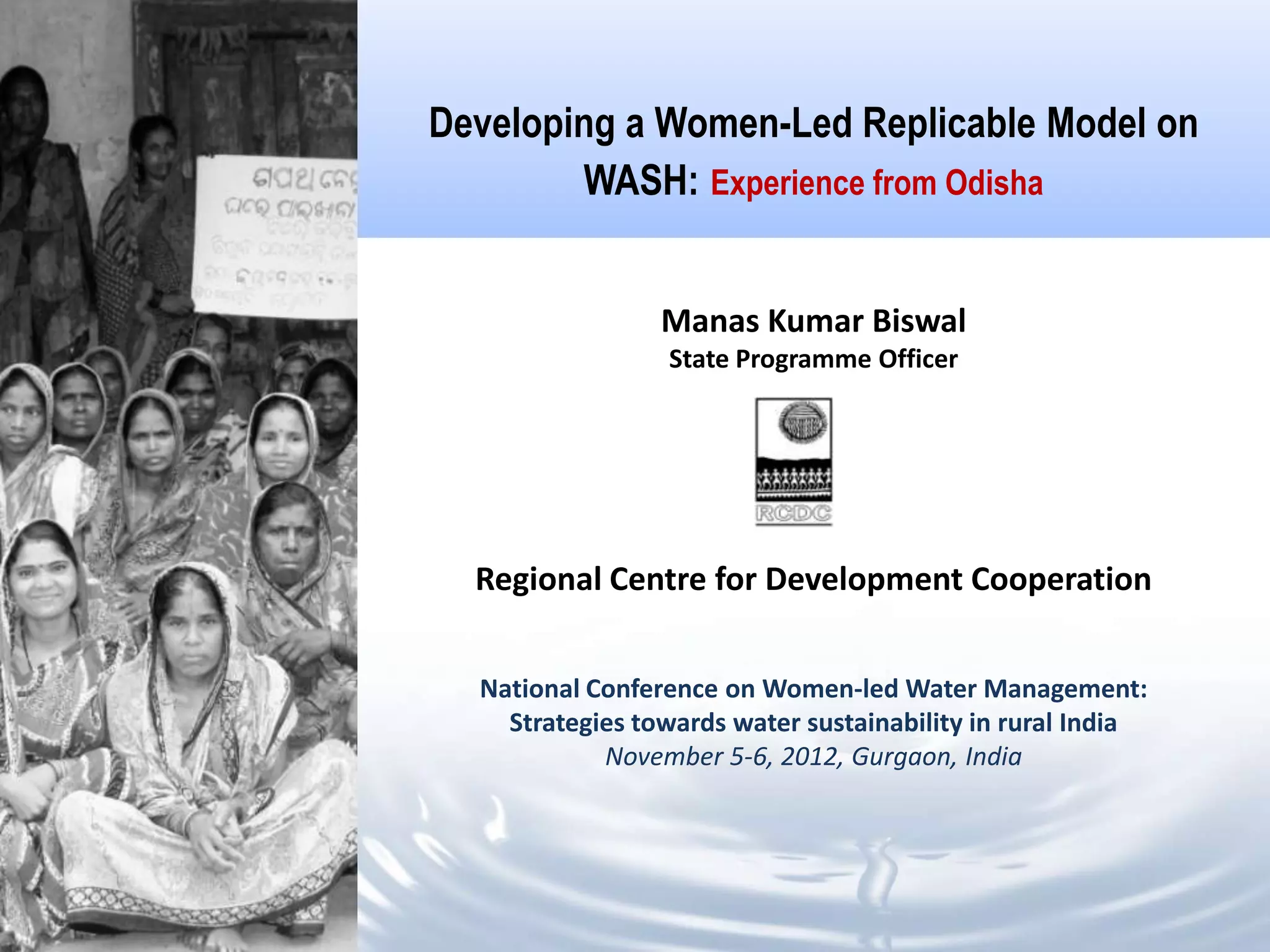 This document discusses the development of a women-led replicable model for water, sanitation, and hygiene (WASH) in Odisha, India. It notes that many rural households in Odisha lack access to water or sanitation. The program aims to develop and demonstrate a model across 30 panchayats benefiting over 167,000 people. Key aspects of the model include situational analysis, awareness building, institution building like water and sanitation committees, capacity building, participatory planning, and developing women's leadership and decision-making roles. Qualitative outcomes observed include greater women's participation in various WASH activities and decision making processes.