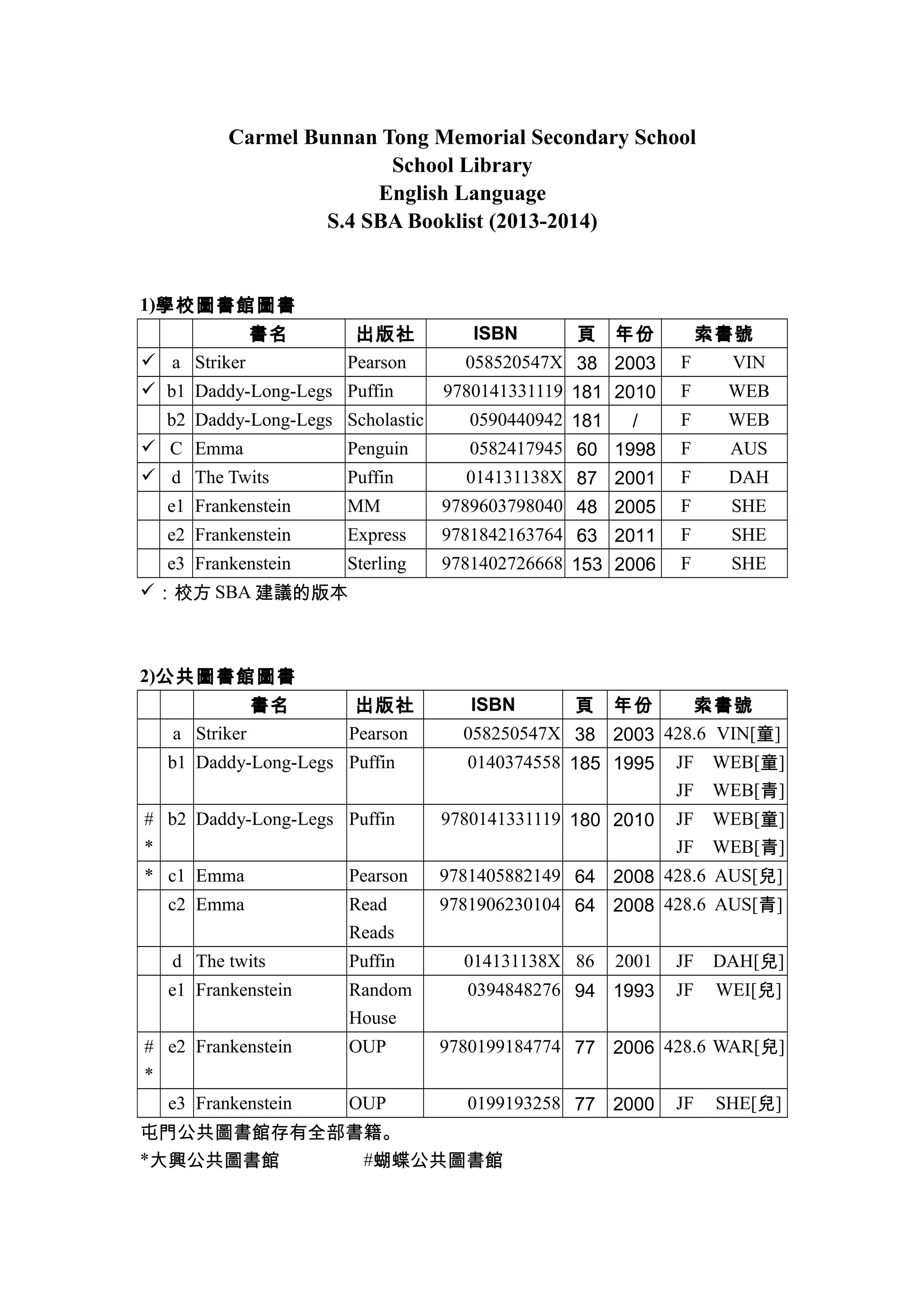 这是2013-2014学年Carmel Bunnan Tong Memorial Secondary School图书馆的英语语言S.4 SBA书单。书籍包括《Striker》、《Daddy-Long-Legs》、《Emma》、《The Twits》和《Frankenstein》,涵盖了不同出版社和版本的信息。公共图书馆如屯门、大兴和蝴蝶图书馆也提供这些书籍。
