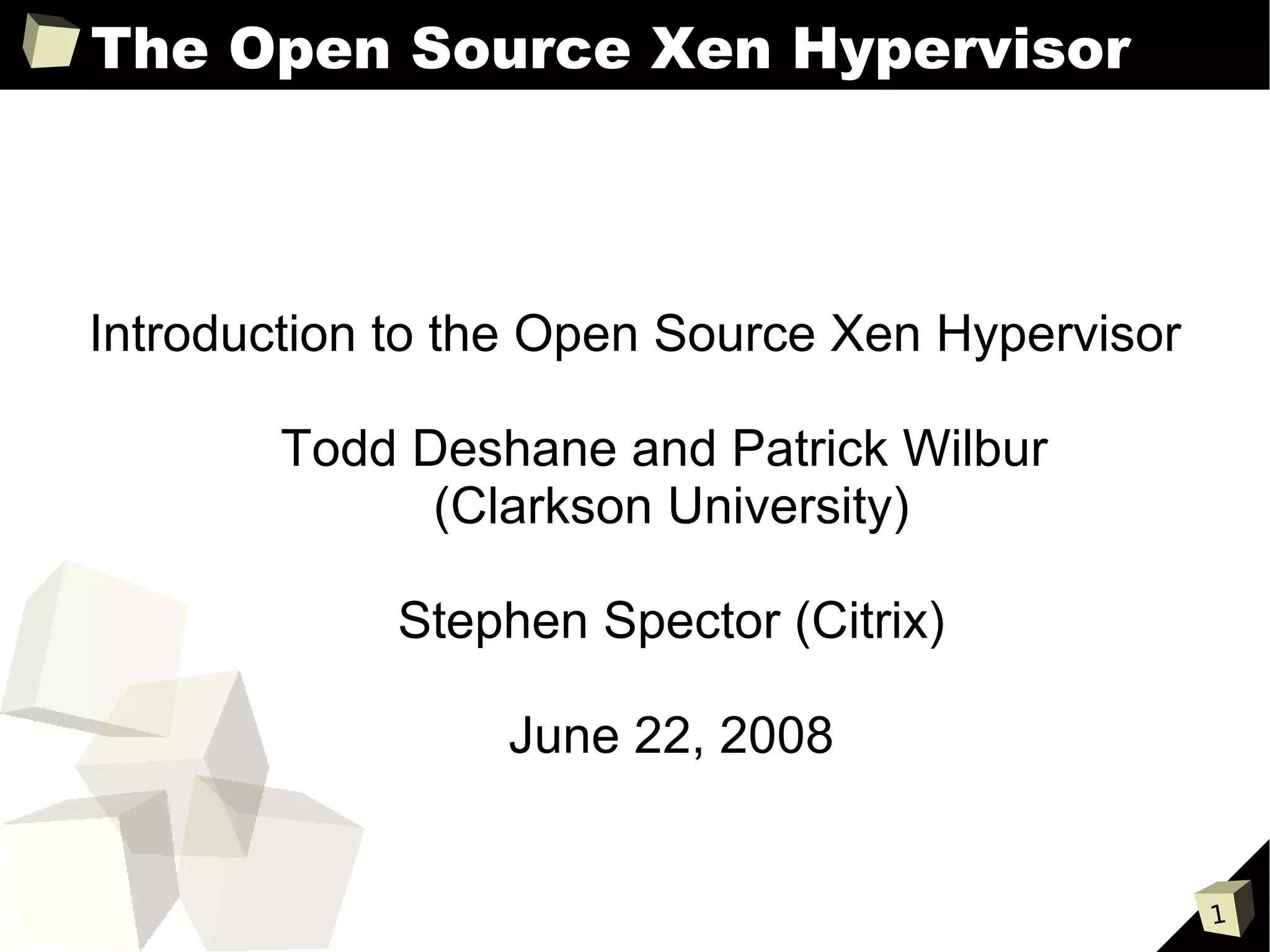 The document provides an overview of the Open Source Xen Hypervisor, including introductions to virtualization concepts, the Xen architecture, installing and configuring Xen and guest virtual machines, and advanced topics like devices and network configurations. It includes hands-on demonstrations of installing Xen, creating paravirtualized and hardware virtualized guests, and interacting with guests using tools like VNC. The document is intended as training material for a full-day course on using the open source Xen hypervisor.