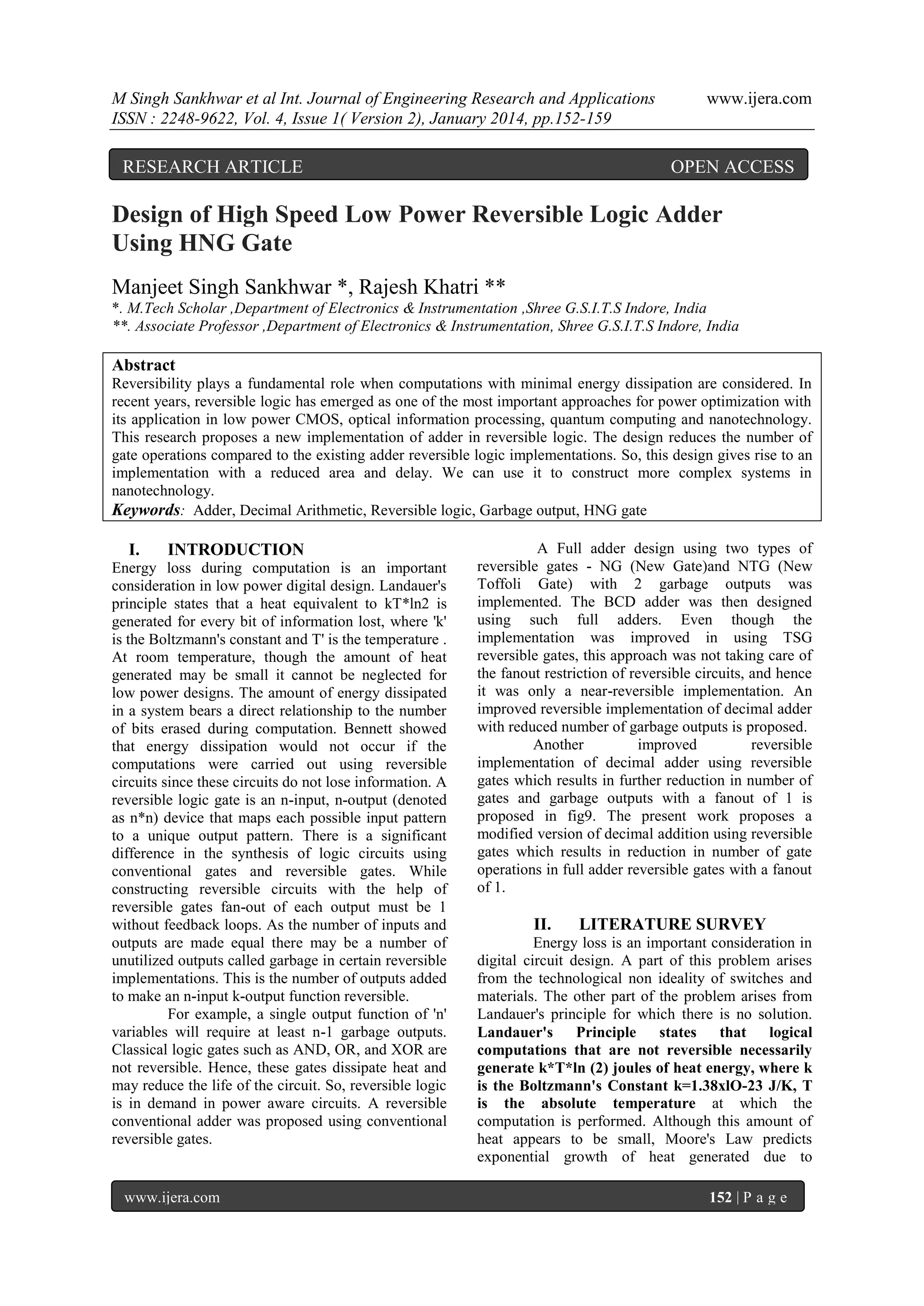 This research article presents a new design for a high-speed, low-power reversible logic adder using HNG gates, aiming to minimize energy dissipation through reversible computing principles. The proposed implementation reduces the number of gate operations and garbage outputs compared to existing designs, making it suitable for applications in nanotechnology. The findings suggest that this design can be extended for larger parallel binary adder units and other low-power circuits.