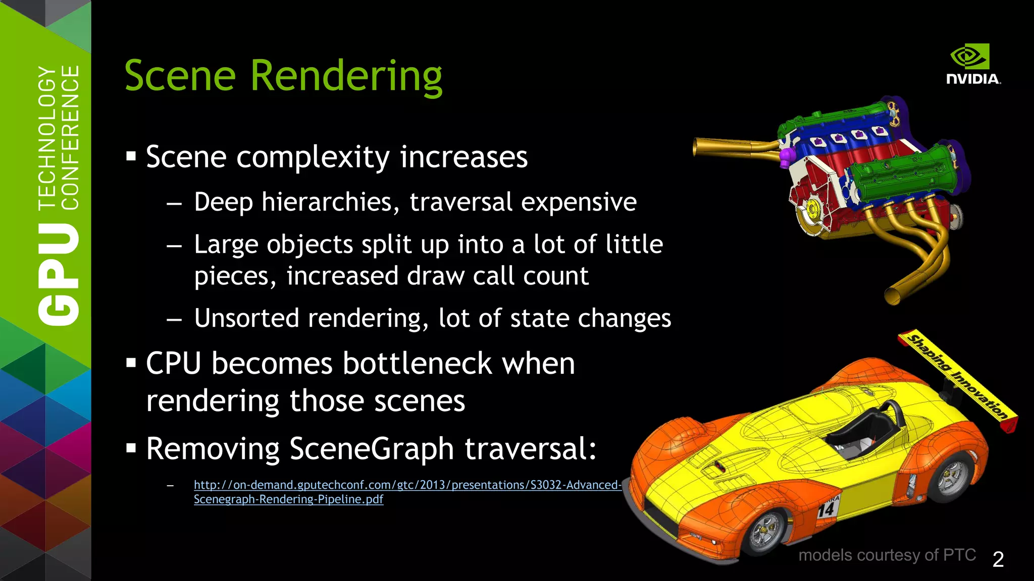 The document discusses advanced OpenGL 4.4 scene rendering techniques, addressing challenges in rendering complex scenes due to high triangle counts and increased CPU bottlenecks. It outlines strategies to optimize performance by minimizing CPU/GPU interactions, avoiding data redundancy, and utilizing GPU-based culling and multi-draw indirect methods. Benchmarks show significant performance improvements, with reductions in rendering times through efficient batching and reduced API calls.