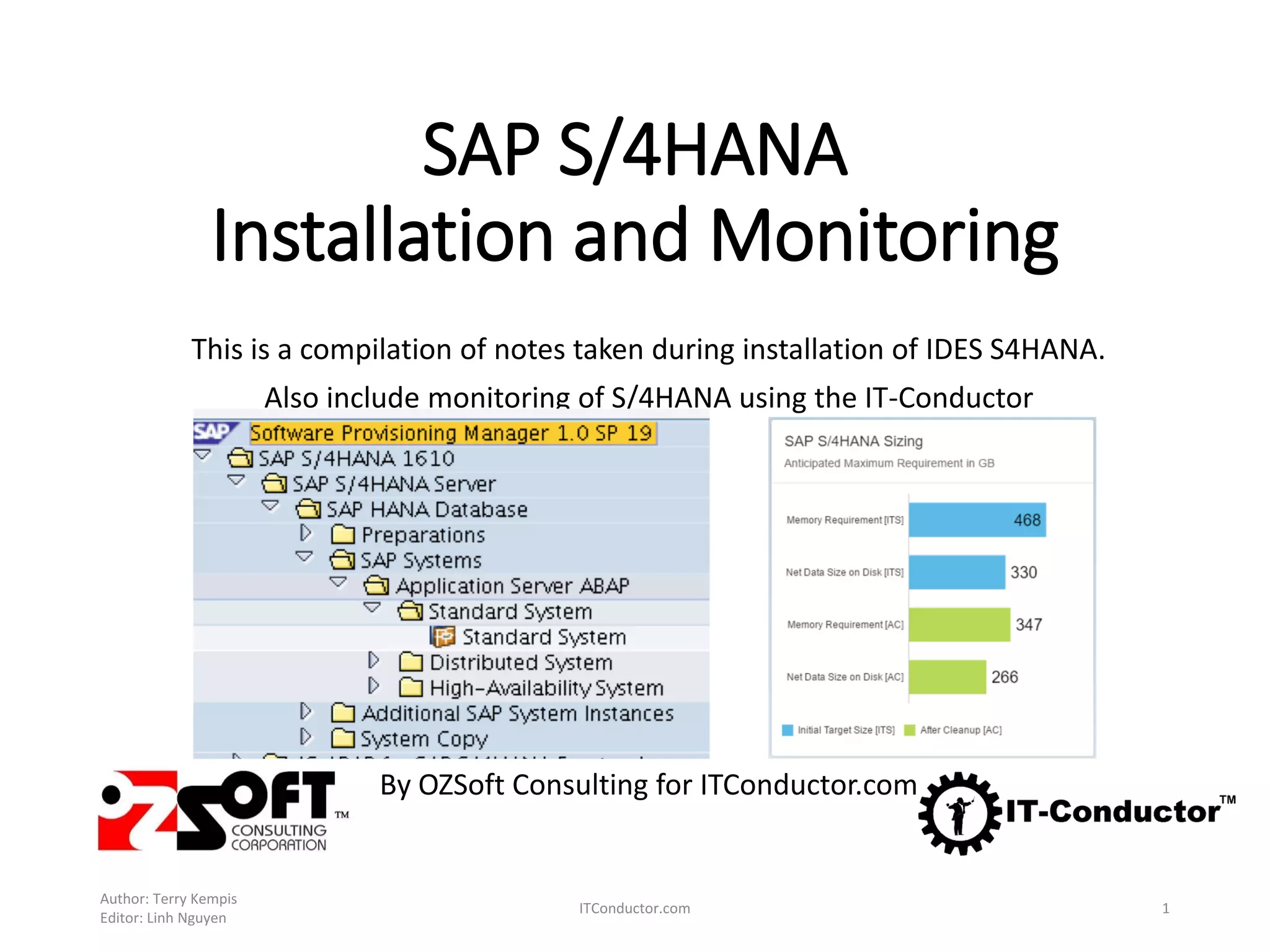 The document is a comprehensive guide on the installation and monitoring of SAP S/4HANA using the IT-Conductor tool. It outlines the installation prerequisites, steps for deploying both the HANA server and ABAP server, and methods for monitoring system performance and space reclamation. Additionally, it highlights the differences in deployment complexity between cloud and on-premise setups, along with contact information for further inquiries.