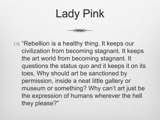 Lady Pink discusses graffiti as a form of rebellion that questions societal norms and status quo. Graffiti originated from markings found in Pompeii that were seen as a pure creative urge. Graffiti was most prominent in Roman times as a way for citizens to express dissent against oppressive authority. In the Victorian era, graffiti lost popularity but negative attitudes emerged by the late 19th century as it became associated with lower classes. Photographer Brassaï brought graffiti to public attention in the 1930s through his documentation. Tagging began as artists left names on trains, representing freedom of movement. Graffiti became more elaborate and competitive over time and is an addictive and dangerous male-dominated activity. Situationists used gra