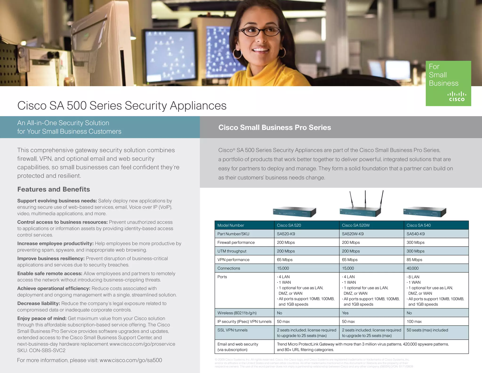 The Cisco SA 500 Series Security Appliances provide an all-in-one security solution for small businesses with firewall, VPN, and optional email and web security capabilities. The appliances support evolving business needs, control access to resources, and increase employee productivity while improving business resiliency. The appliances are part of Cisco's Small Business Pro Series and include the Cisco SA 520, SA 520W, and SA 540 models, which vary in performance, connections, ports, and included security features.