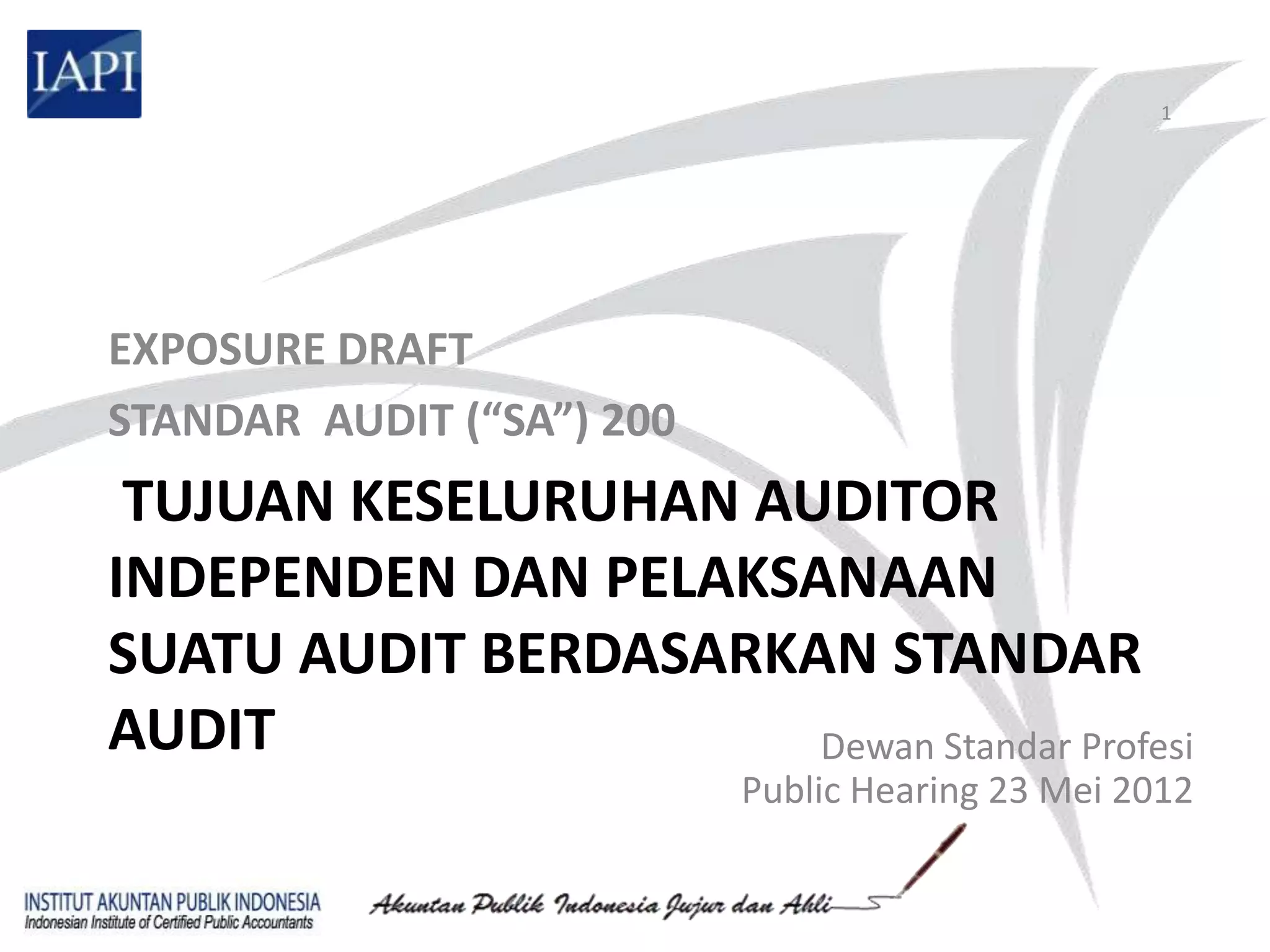 Dokumen ini merupakan exposure draft dari standar audit yang menetapkan tujuan keseluruhan auditor independen serta ruang lingkup dan tanggung jawabnya dalam melaksanakan audit atas laporan keuangan. Standar ini juga menekankan pentingnya kepatuhan terhadap kerangka pelaporan yang berlaku dan prosedur pengendalian mutu selama audit untuk memastikan keyakinan yang memadai tentang kewajaran laporan keuangan. Selain itu, auditor diharuskan untuk mempertimbangkan etika dan skeptisisme profesional dalam menjalankan tugasnya.