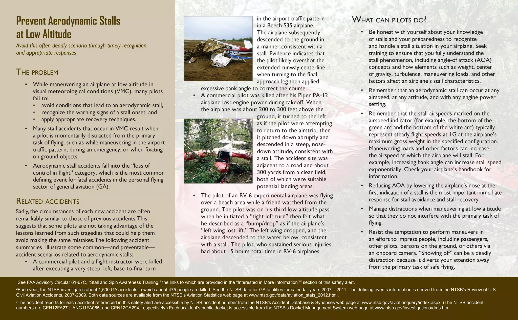 The document addresses the issue of aerodynamic stalls occurring at low altitudes, highlighting that many pilots fail to recognize stall warning signs and apply appropriate recovery techniques. It cites several accident examples where such stalls led to fatalities and emphasizes the importance of pilot training and awareness to prevent similar occurrences. Recommendations include understanding stall characteristics, managing distractions, and seeking proper training to enhance flying skills and safety.
