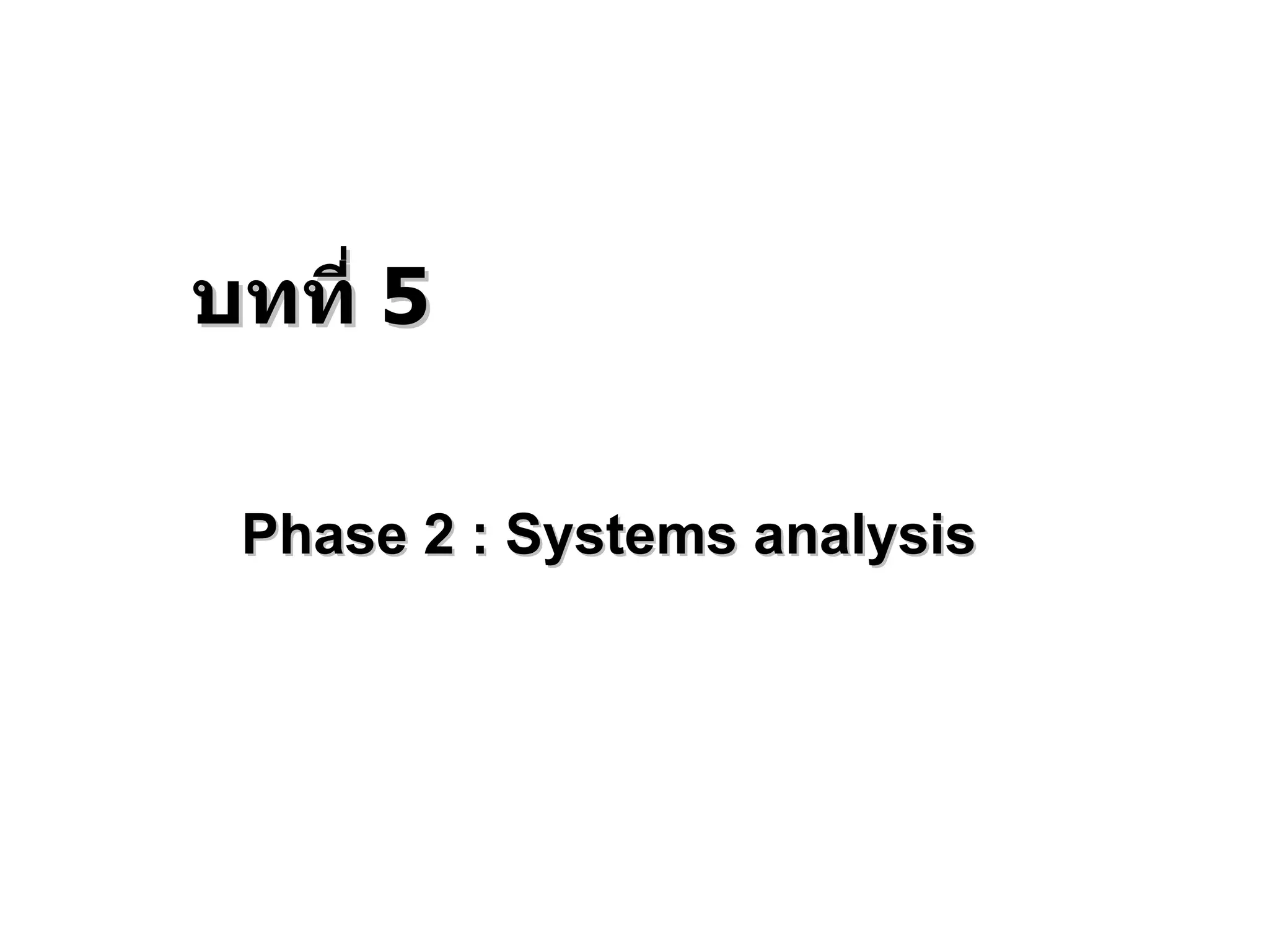 บทที่ 3Phase 2 : Systems Analysis “ System Analysis is the investigation of the business and user requirements of an information system” ขั้นตอนการทำงานในระบบปัจจุบัน ปัญหาที่เกิดขึ้น ความต้องการที่อยากให้มีในระบบใหม่
