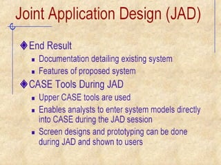 บทที่ 3Phase 2 :Systems Analysis – Determining Requirement JAD Sessions Joint Application Design เป็นการร่วมมือกันในการทำงานในกลุ่มของ stakeholders Used to expedite the investigation of systems requirements Seeks to compress fact-finding, modeling, policy formation, and verification activities into a shorter time frame Critical factor is to have all important stakeholders present