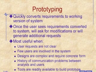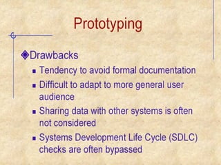Discovery Prototyping Canexperiment to develop understanding of how system might work Aids in determining feasibility and usefulness of system before development Serves as training mechanism Aids in building test plans and scenarios May minimize time spent on fact-finding Developers may need to be trained in prototyping Users may develop unrealistic expectations Could extend development schedule Advantages Disadvantages