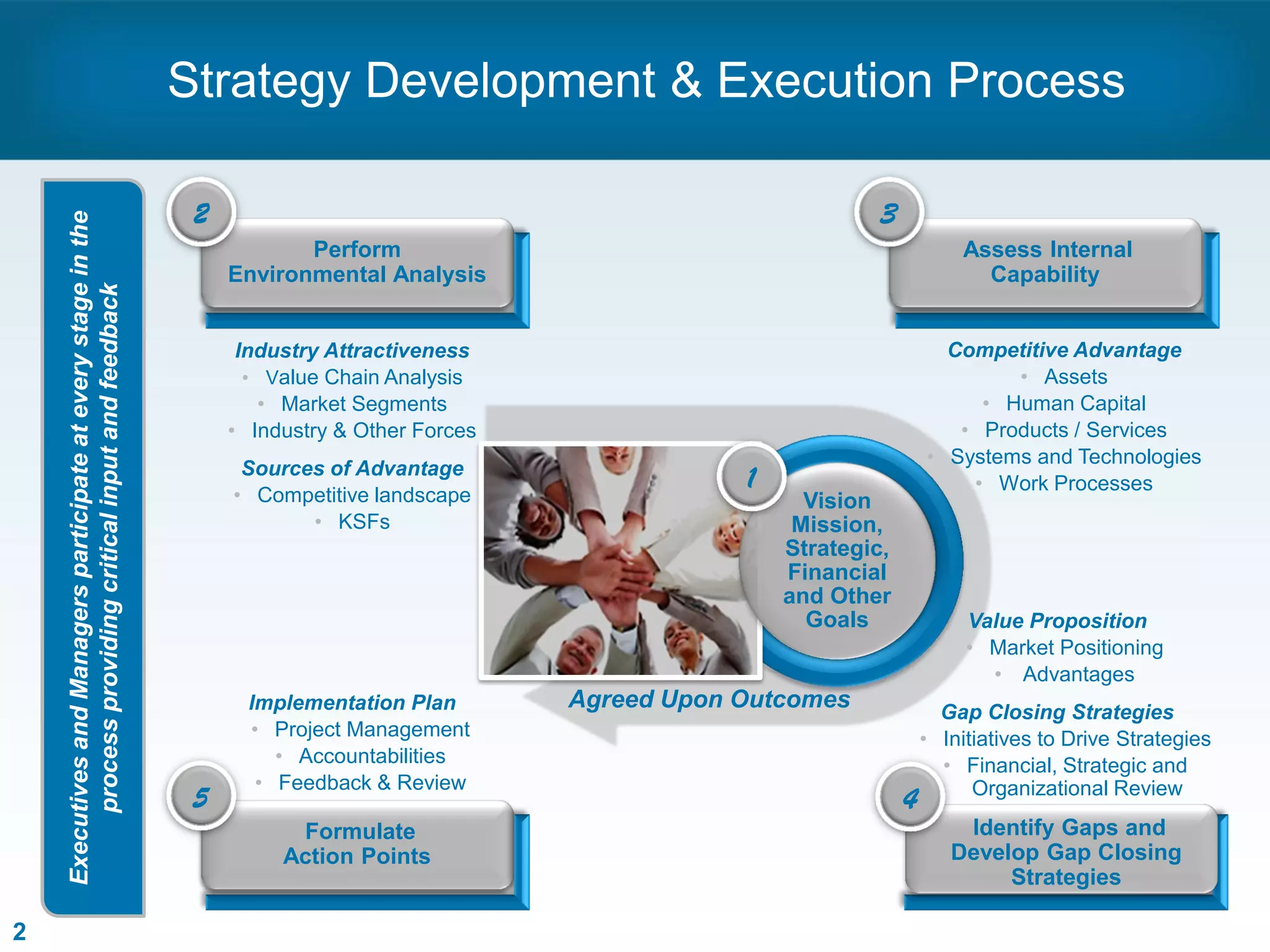 The document outlines strategic consulting processes for organizations, including environmental analysis, internal capability assessment, and gap closing strategies. It covers the stages of mergers and acquisitions, culture change implementation, and industry/market research. Additionally, it details sales transformation processes to secure management commitment and build a repeatable sales process aligned with market behaviors.