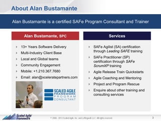 The document outlines the Scaled Agile Framework (SAFe), designed to implement lean and agile practices at enterprise scale, emphasizing alignment, collaboration, and delivery. It discusses SAFe's core values, foundational concepts, and provides insights into its benefits, including improved productivity, faster time-to-market, and enhanced code quality. Additionally, it highlights the importance of agile coaches and provides guidance on next steps for adoption and training.