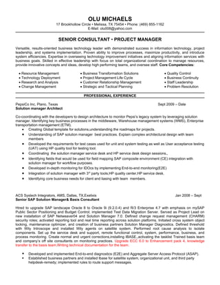 Olu Michaels has over 15 years of experience as a senior consultant and project manager with expertise in SAP solutions including Solution Manager, ECC, and NetWeaver. He has a proven track record of successfully managing SAP implementations, upgrades, and technology improvement projects. His core competencies include resource management, project management, quality control, change management, and strategic planning.