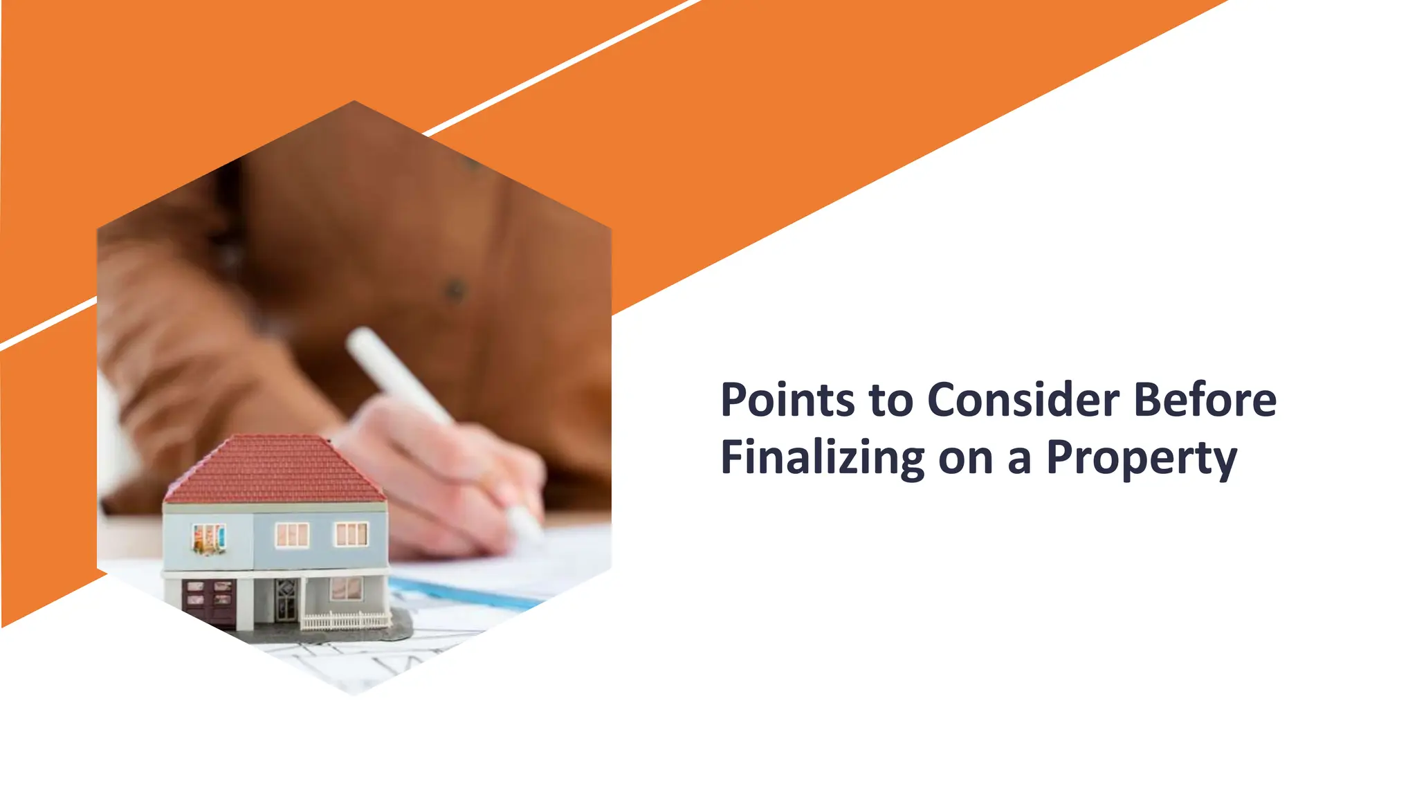 Before finalizing a property, it's crucial to evaluate your financial status, investigate the builder's reputation, and inquire about available bank tie-ups for home loans. Checking the neighborhood and its connectivity, as well as ensuring security around the property, are also essential steps in making a sound investment. These considerations will help ensure a well-informed decision when purchasing a home.