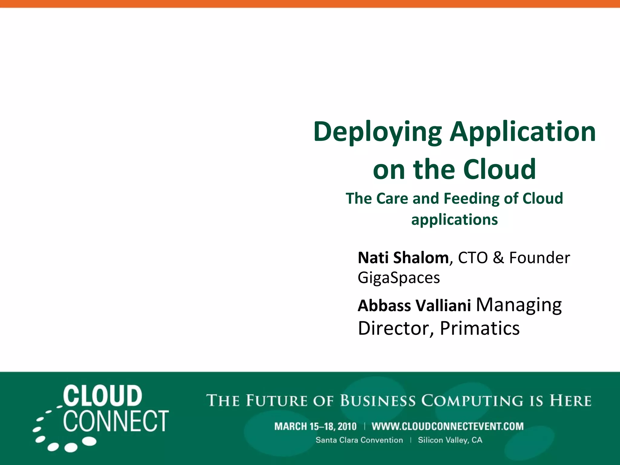 The document discusses deploying applications in the cloud, emphasizing the importance of virtualization throughout the application stack for better resource utilization and automatic load balancing. It outlines the challenges faced by mid-size banks in managing cloud infrastructure and achieving scalability, while proposing a multi-tenant, scalable architecture as a solution. Best practices for transitioning to cloud environments include minimizing vendor lock-in and ensuring application portability to adapt to evolving technologies.