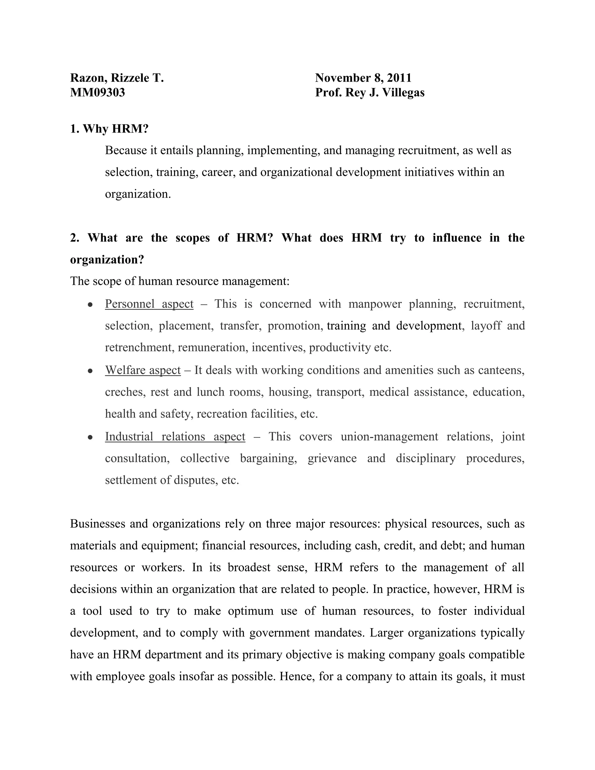 Human resource management (HRM) involves planning, implementing, and managing various human resource functions within an organization, including recruitment, selection, training, career development, and more. The scope of HRM includes ensuring personnel needs are met, managing employee welfare, and handling industrial relations. HRM aims to make optimal use of human resources to foster individual development and comply with legal mandates. Key HRM roles include staffing the organization, recruiting and training employees, managing performance, and ensuring compliance with regulations. As a management discipline, HRM incorporates theories from psychology, sociology, and biology but often relies on simplistic models that do not fully capture the complex constraints of human behavior within organizations.