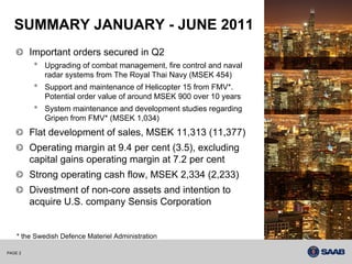 - Important orders secured in Q2 include upgrading combat systems for the Royal Thai Navy worth MSEK 454 and a potential MSEK 900 order over 10 years for maintenance of Helicopter 15 from FMV.