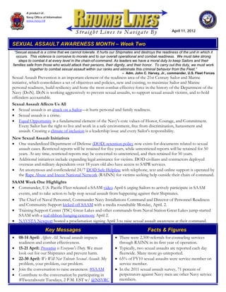 This document provides information about Sexual Assault Awareness Month (SAAM) from the Navy. It includes a quote from Adm. John C. Harvey emphasizing that sexual assault hurts readiness and that leaders must work to eliminate it. It discusses the Navy's initiatives to prevent sexual assault and support victims, including a confidential helpline. It provides key messages and facts about sexual assault prevalence and reporting within the Navy to raise awareness during SAAM.