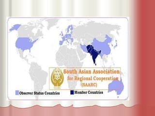 The South Asian Association for Regional Cooperation (SAARC) was established in 1985 to promote economic and social progress among South Asian nations. The association faces challenges such as ongoing territorial disputes, political instability, and low intra-regional trade, particularly between India and Pakistan. Despite these issues, SAARC has potential for growth through increased cooperation and common cultural affinities, with opportunities for addressing regional challenges like climate change and economic integration.