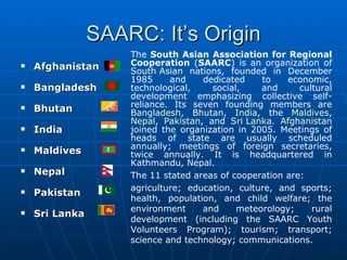 The South Asian Association for Regional Cooperation (SAARC) comprises eight member states - Afghanistan, Bangladesh, Bhutan, Maldives, Nepal, Pakistan, Sri Lanka. SAARC was established in 1985 when its charter was formally adopted. It aims to promote cooperation in economic, social, cultural and technical fields among South Asian nations.