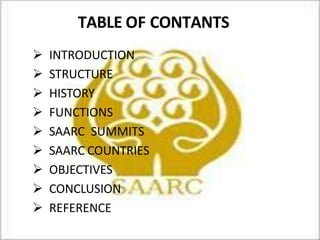 This document provides an overview of the South Asian Association for Regional Cooperation (SAARC). It discusses that SAARC was established in 1985 and currently has 8 member countries. The objectives of SAARC include promoting economic and social development in South Asia. It also outlines the structure and history of SAARC, describes the SAARC summits that have been held, and summarizes the goals and functions of the organization.