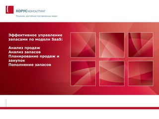 Документ описывает эффективное управление запасами по модели SaaS, выделяя основные проблемы неэффективного управления, такие как нехватка и излишки товара. Программный продукт Mycroft Assistant предлагает профессиональные инструменты для анализа и планирования запасов, обеспечивая улучшение прибыли и клиентского сервиса. Решение доступно для среднего и малого бизнеса с абонентской платой от 15000 рублей в месяц и предоставляет быструю интеграцию с учетными системами.