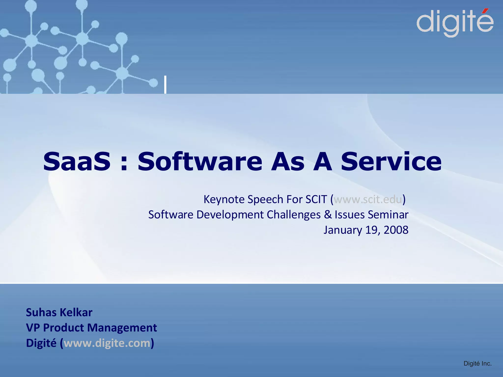 This document discusses Software as a Service (SaaS). It defines SaaS as software deployed as a hosted service and accessed over the Internet. Key advantages of SaaS include lower costs since users pay monthly subscription fees rather than large upfront licensing fees. The document outlines the history and growth of SaaS, describing how it has evolved from early ASP models. It also discusses the paradigm shifts required in application architecture and business models for SaaS, including moving to a multi-tenant architecture that is scalable and configurable. The speaker emphasizes that SaaS will have a major impact on the software industry and future IT professionals should closely track developments in SaaS.