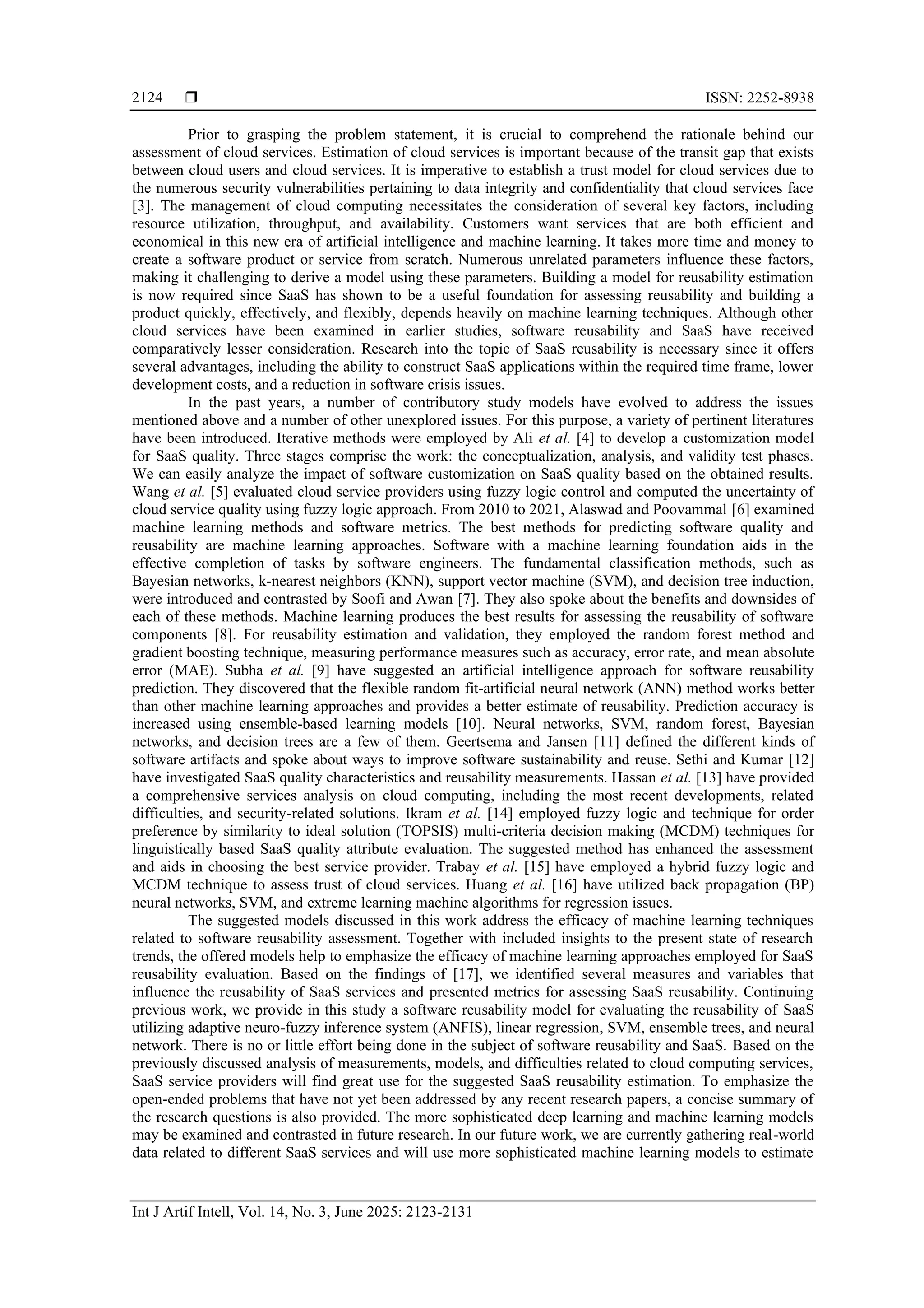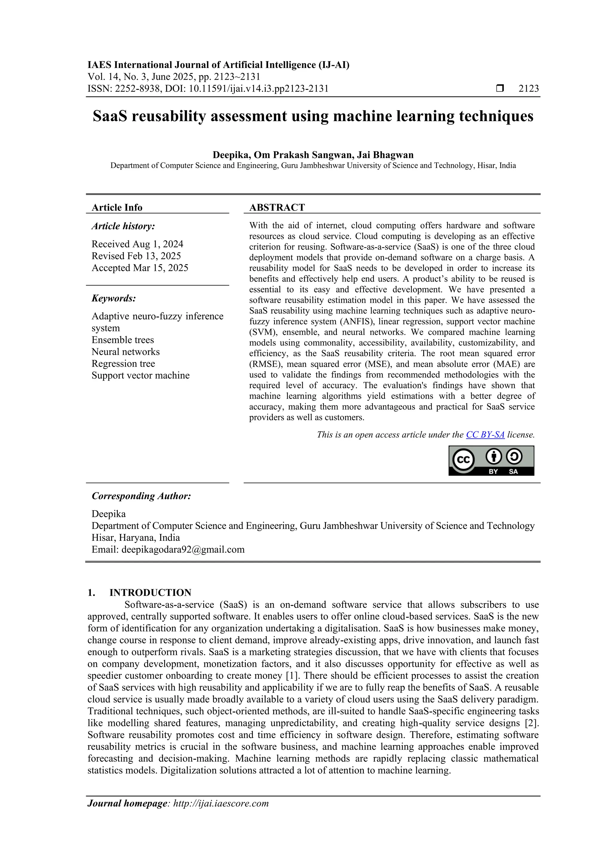 With the aid of internet, cloud computing offers hardware and software resources as cloud service. Cloud computing is developing as an effective criterion for reusing. Software-as-a-service (SaaS) is one of the three cloud deployment models that provide on-demand software on a charge basis. A reusability model for SaaS needs to be developed in order to increase its benefits and effectively help end users. A product’s ability to be reused is essential to its easy and effective development. We have presented a software reusability estimation model in this paper. We have assessed the SaaS reusability using machine learning techniques such as adaptive neuro fuzzy inference system (ANFIS), linear regression, support vector machine (SVM), ensemble, and neural networks. We compared machine learning models using commonality, accessibility, availability, customizability, and efficiency, as the SaaS reusability criteria. The root mean squared error (RMSE), mean squared error (MSE), and mean absolute error (MAE) are used to validate the findings from recommended methodologies with the required level of accuracy. The evaluation's findings have shown that machine learning algorithms yield estimations with a better degree of accuracy, making them more advantageous and practical for SaaS service providers as well as customers.