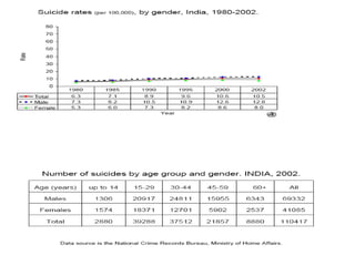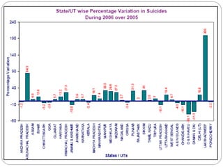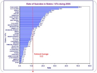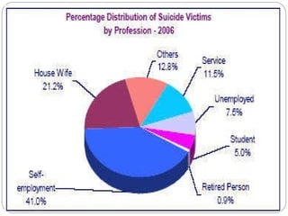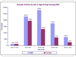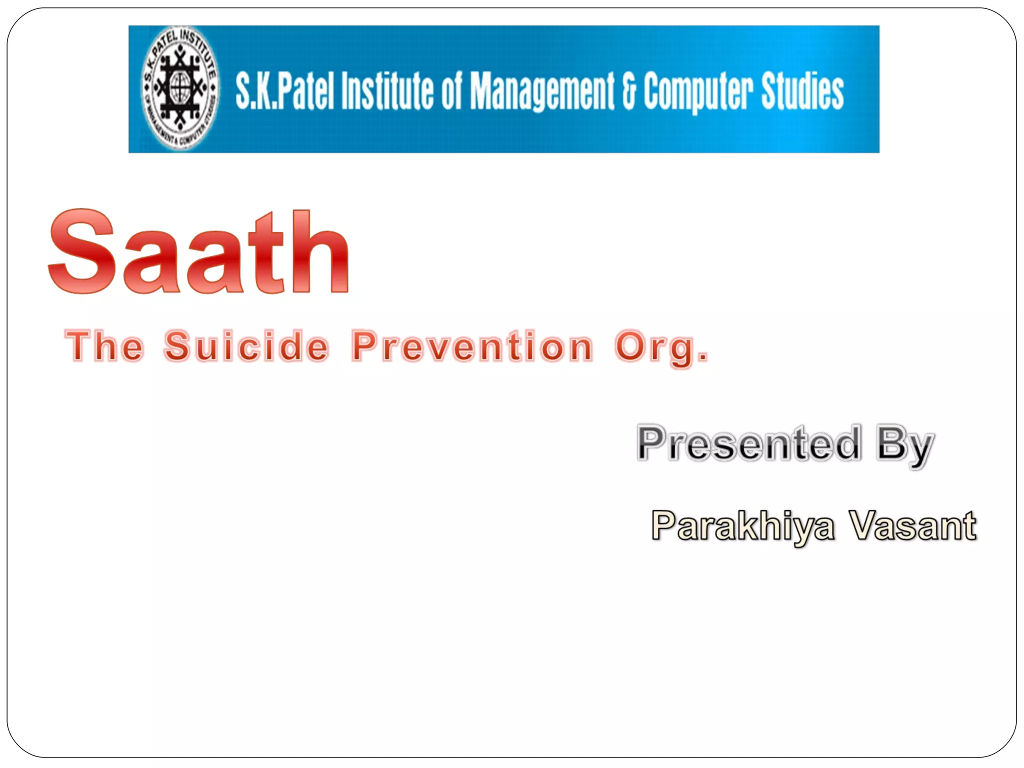 Saath is a suicide prevention organization in Ahmedabad, India. It was founded in 1998 to provide emotional support to those in distress and prevent suicide. Saath operates entirely through volunteers and provides free counseling services. Research conducted by Saath found the leading causes of suicide among youth are educational pressure and failed relationships. To address this issue, Saath suggests reforming India's education system and encouraging development of coping skills and awareness among youth, parents, and institutions.