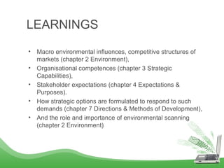 SABMiller has shown flexibility in its operations since inception by recognizing market potential in South African mining communities. It came to dominate the beverage industry in South Africa and Southern Africa through acquisitions. As constraints emerged, it shifted from a synergy strategy to portfolio management, then back to focus on brewing. Currently operating worldwide, SABMiller's growth has come through developing markets, acquisitions, and brand growth. Strategic options include further consolidation, product development, and market expansion in Asia/Europe while maintaining skills in developing markets.