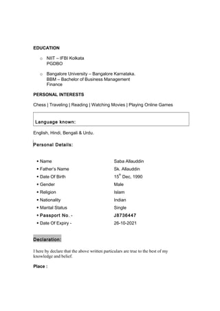 Saba Allauddin is an experienced banker currently working as a Senior Officer at ICICI Bank in Malda, West Bengal since 2013. She has a Post Graduate Diploma in Business Operations from NIIT and a Bachelor's degree in Business Management with a Finance specialization from Bangalore University. She is seeking an opportunity for career advancement in a large banking organization and has technical skills including Microsoft Office, Tally ERP9, and Finacle banking software. Her personal interests include chess, traveling, reading, movies, and online games.