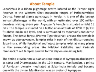 Sabarimala is a famous Hindu pilgrimage site in Kerala, India located in the Western Ghat mountains. It is one of the largest annual pilgrimages in the world, with over 100 million devotees visiting every year to worship at the Ayyappan temple. The temple is situated on a hilltop at an altitude of 1260 meters above sea level and is surrounded by dense forests. The shrine at Sabarimala is an ancient temple dedicated to Ayyappan, an avatar of the Hindu god Dharma Shasta.
