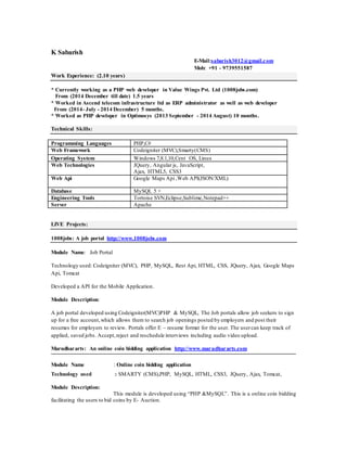 This document contains the resume of K Sabarish which outlines his work experience as a PHP web developer, technical skills including PHP, Codeigniter, MySQL, technical projects including job portals, coin bidding applications, and chit fund portals developed using technologies like PHP, Codeigniter and MySQL. It also includes his academic qualifications of MCA from Bangalore Institute of Technology and BCA from Bapu Degree College.