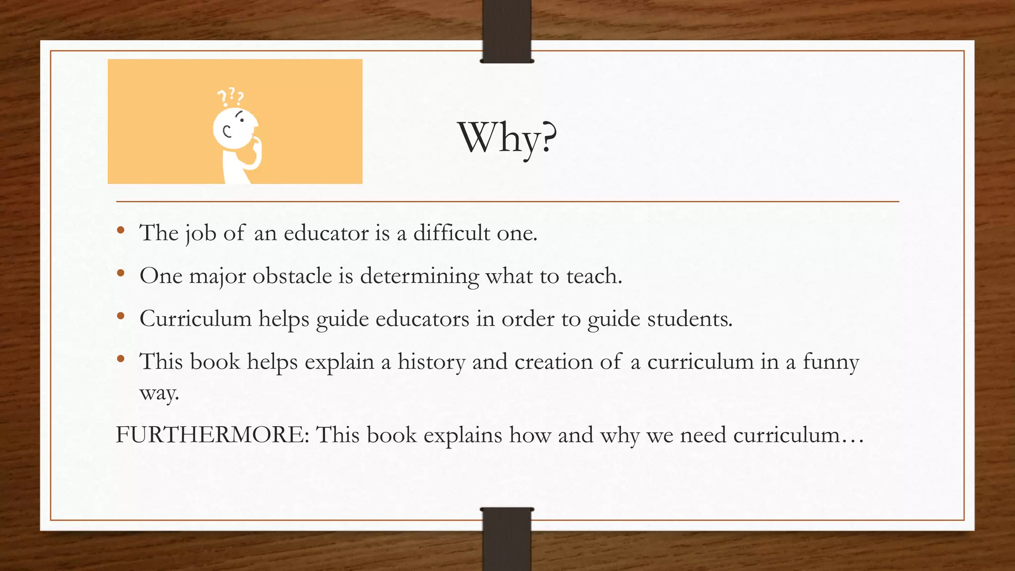 This book uses humor to explain the history and development of curriculum. It demonstrates how curriculum was created to share information equally among students and allow adjustment to change. The book also shows how identifying desired learning outcomes led to the development of curriculum based on survival needs and engaging students in similar tasks as adults. It assessed learning through active demonstrations from students and added more curriculum over time. The comical style helps different learners understand the content.