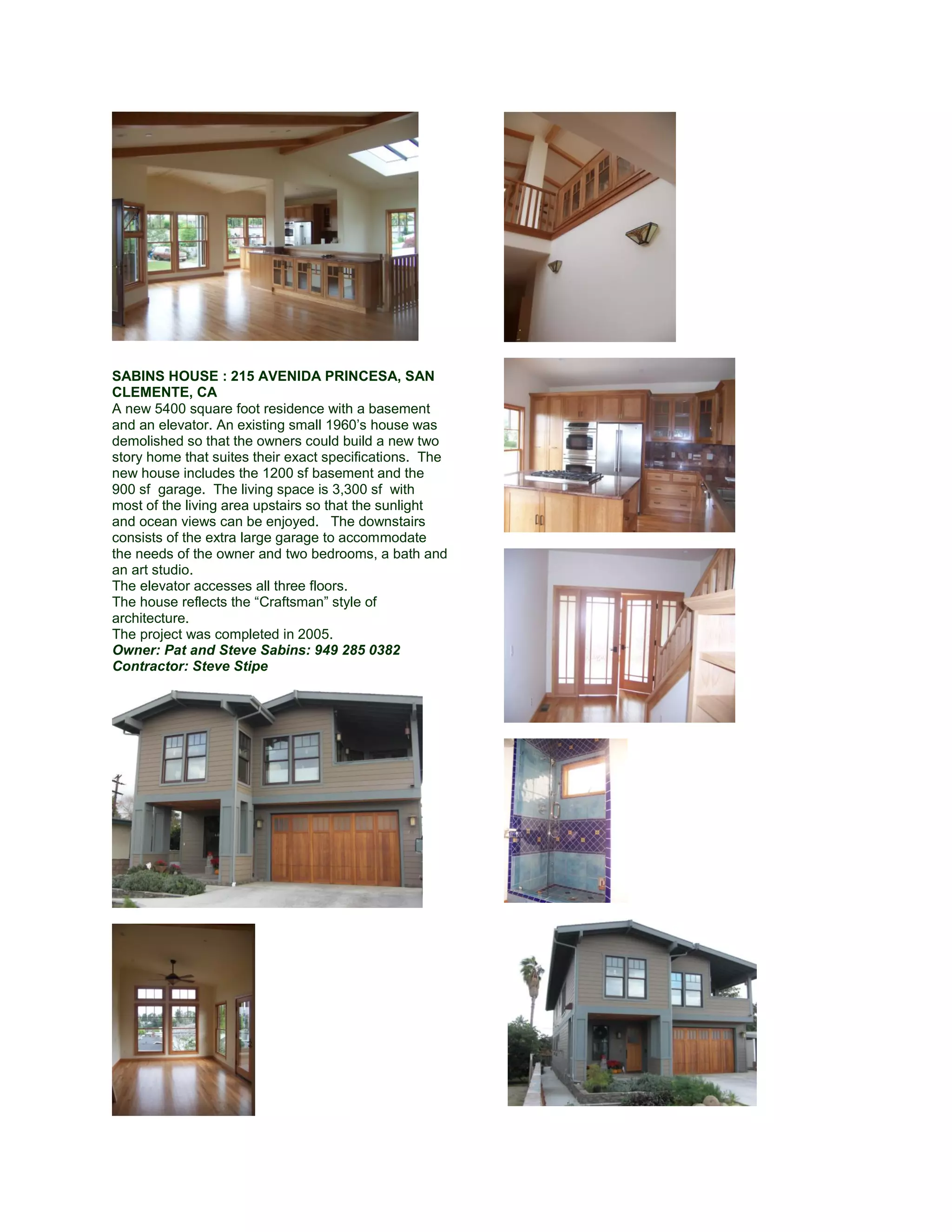 A new 5,400 square foot two-story home was built in 2005 on Avenida Princesa in San Clemente, CA after demolishing an existing 1960s house. The new home has a 1,200 square foot basement, 900 square foot garage, and 3,300 square feet of living space primarily upstairs to take advantage of ocean views. The downstairs also includes two bedrooms, a bath, and an art studio in addition to the large garage. The Craftsman style home has an elevator accessing all three floors.