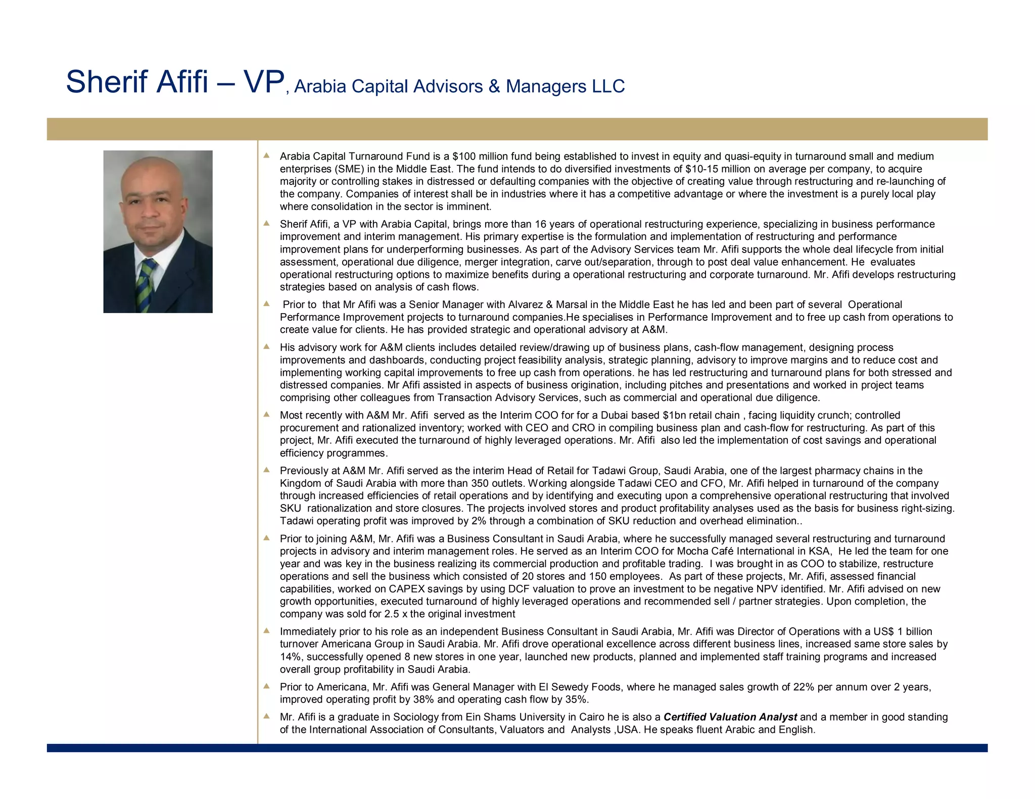 The document provides information about Sherif Afifi and his experience in operational restructuring and turnaround advisory. It details his previous roles leading restructuring projects and interim management positions at Alvarez & Marsal and as an independent consultant in Saudi Arabia. Afifi has over 16 years of experience in business performance improvement, restructuring, and interim management. He is now a VP at Arabia Capital Advisors & Managers focusing on their turnaround fund and advisory services.