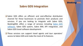 The document outlines the services offered by BookingXML for integrating with Sabre GDS, highlighting the efficiency and cost-effectiveness of this global distribution system for travel agents and tour operators. It details the benefits of Sabre GDS integration, including improved access to travel products, enhanced security through API communication, and the ability to streamline operations. BookingXML’s expertise in Sabre GDS software and API integration aims to optimize travel businesses by providing comprehensive solutions for booking systems across various travel services.
