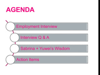 This document provides information and guidance for students regarding an upcoming employment interview assessment. It outlines the interview dates, what students should bring, how to dress, common interview questions and how to answer them effectively. Sample questions are provided as well as tips for following up after the interview. The document emphasizes preparing answers to common questions, practicing responses, and highlighting relevant skills and experiences to differentiate oneself as a strong candidate.