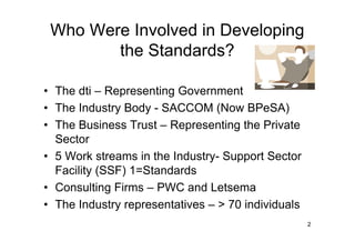 The document discusses the development and purpose of contact center standards in South Africa. It was developed through a collaborative process between government, industry bodies, consulting firms, and over 70 industry representatives. The standards aim to improve customer satisfaction, staff efficiency, quality, revenue, and reduce costs and waste. They cover leadership, operations, human resources, and technology. The standards were created to help South Africa attract offshore business by demonstrating efficiency and quality. Contact centers previously did not measure or address sources of waste. Implementing the standards can help centers operate consistently and successfully meet customer and business objectives.