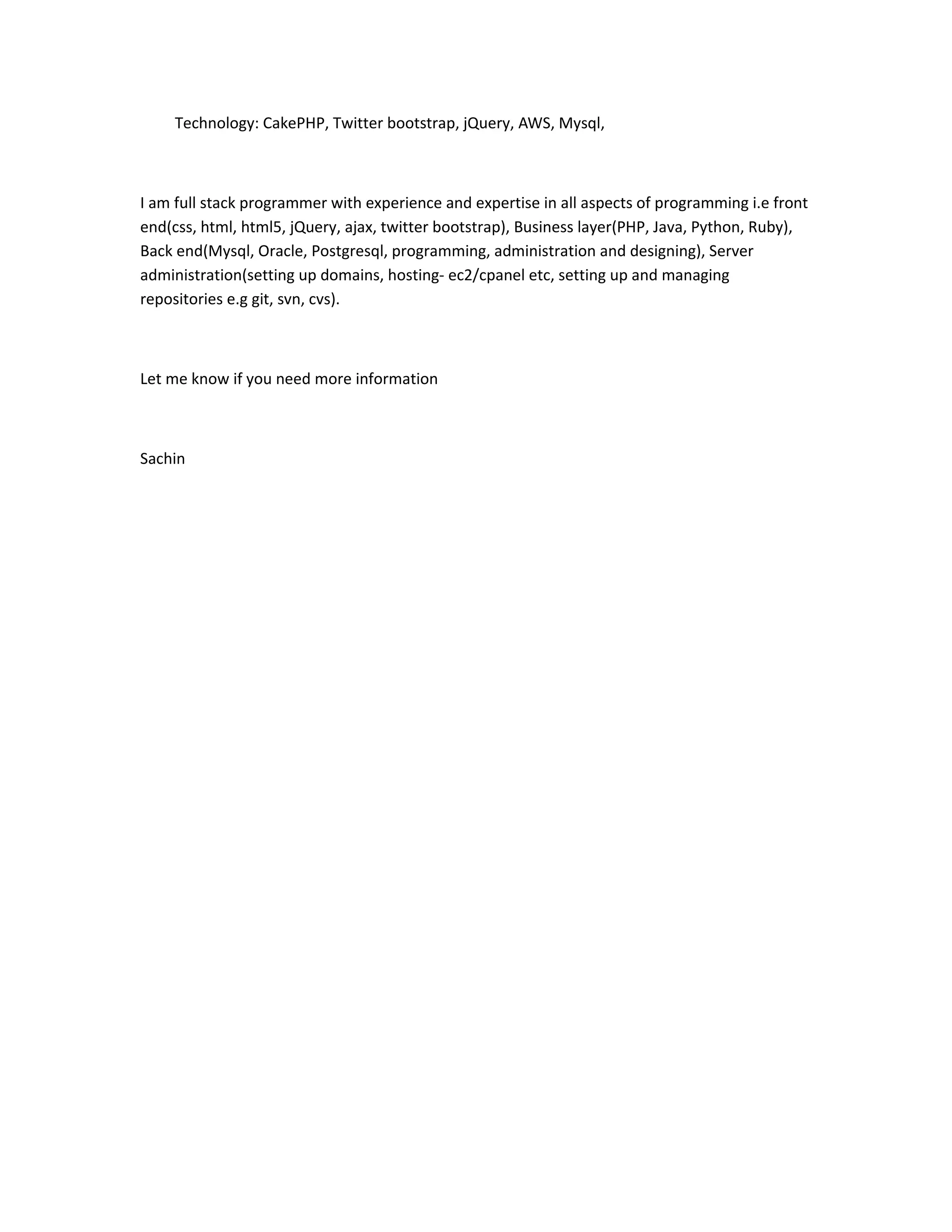 Sachin is a freelance software architect based in Hyderabad, India with over 12 years of experience building software applications using technologies like Java/J2EE, PHP, and Ruby on Rails. For the past 3 years, he has helped several startups develop their products. He has experience serving as CTO for Tripoto where he built the initial MVP and oversaw engineering. He also worked as a software architect and engineering manager at Ketera for 8 years where he built enterprise products in Java/J2EE and managed teams. Sachin has extensive full stack development experience including front-end, back-end, and server administration skills.