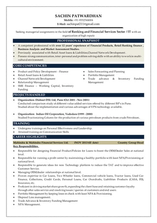 Sachin Patwardhan is a banking and financial services professional with over 12 years of experience seeking managerial assignments. He has extensive experience in retail banking, finance, business analysis, and portfolio management. Currently he is the Country Group Head at Mahindra & Mahindra Financial Services Ltd where he is responsible for product development, maintaining portfolio quality, and generating new technology solutions. Previously he has held roles like Regional Manager, Area Sales Manager, and Relationship Manager at HDFC Bank Ltd and ICICI Bank Ltd where he has consistently achieved business targets and received various awards.