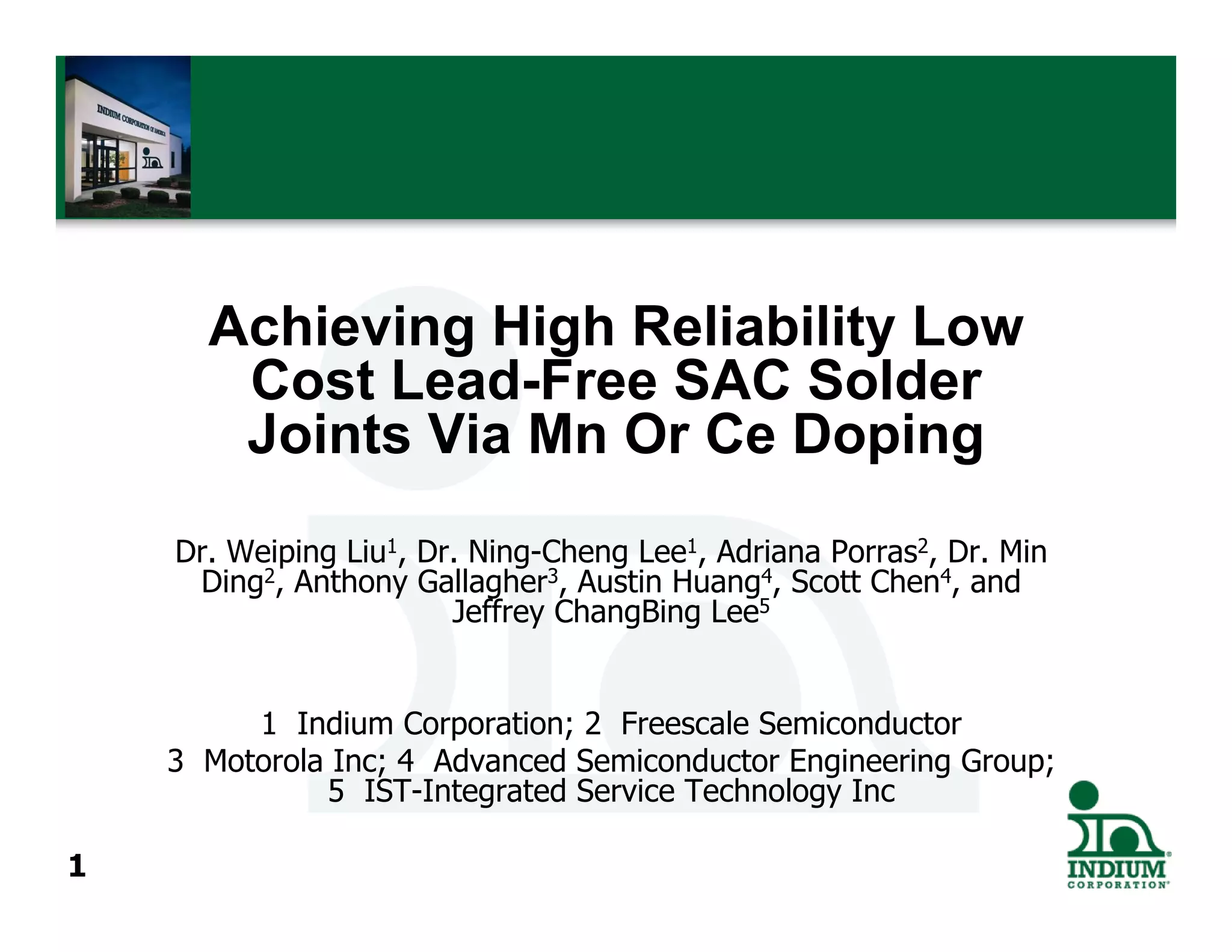 This document summarizes research on achieving high reliability and low-cost lead-free solder joints using manganese or cerium doping of tin-silver-copper (SAC) solder. Experimental results show that SAC doped with 0.05% manganese (SACM) or 0.02% cerium (SACC) outperforms baseline SAC105 and SAC305 alloys in drop test reliability and thermal cycling performance. Specifically, SACM and SACC exhibit higher drop test lifetimes and allow packages to withstand higher dynamic bending strains compared to SAC105 and SAC305. This research demonstrates that minor manganese or cerium doping of SAC alloys can improve