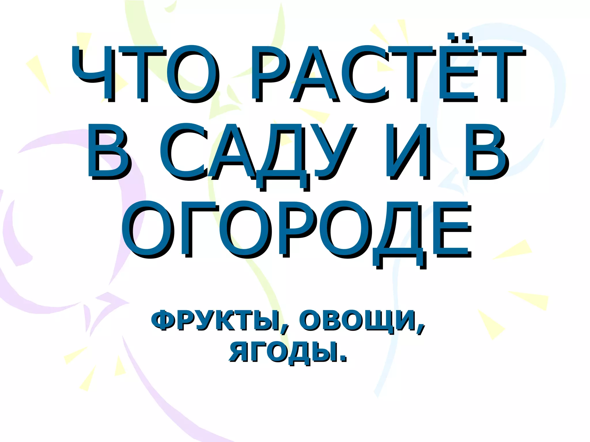 Документ описывает, какие фрукты, овощи и ягоды могут расти в саду и огороде. Упоминаются такие фрукты, как абрикосы, апельсины и груши, а также овощи и ягоды, включая баклажаны, клубнику и малину. Документ предоставляет список различных культур, подходящих для выращивания.