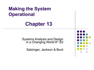 The chapter discusses implementation and deployment activities for a new system. It covers various types of software testing including unit testing, integration testing, usability testing, system testing, and user acceptance testing. Implementation includes programming and testing, while deployment includes data conversion, training users, system testing, and deploying the final solution. Effective planning and management of implementation, testing, and deployment is also discussed.
