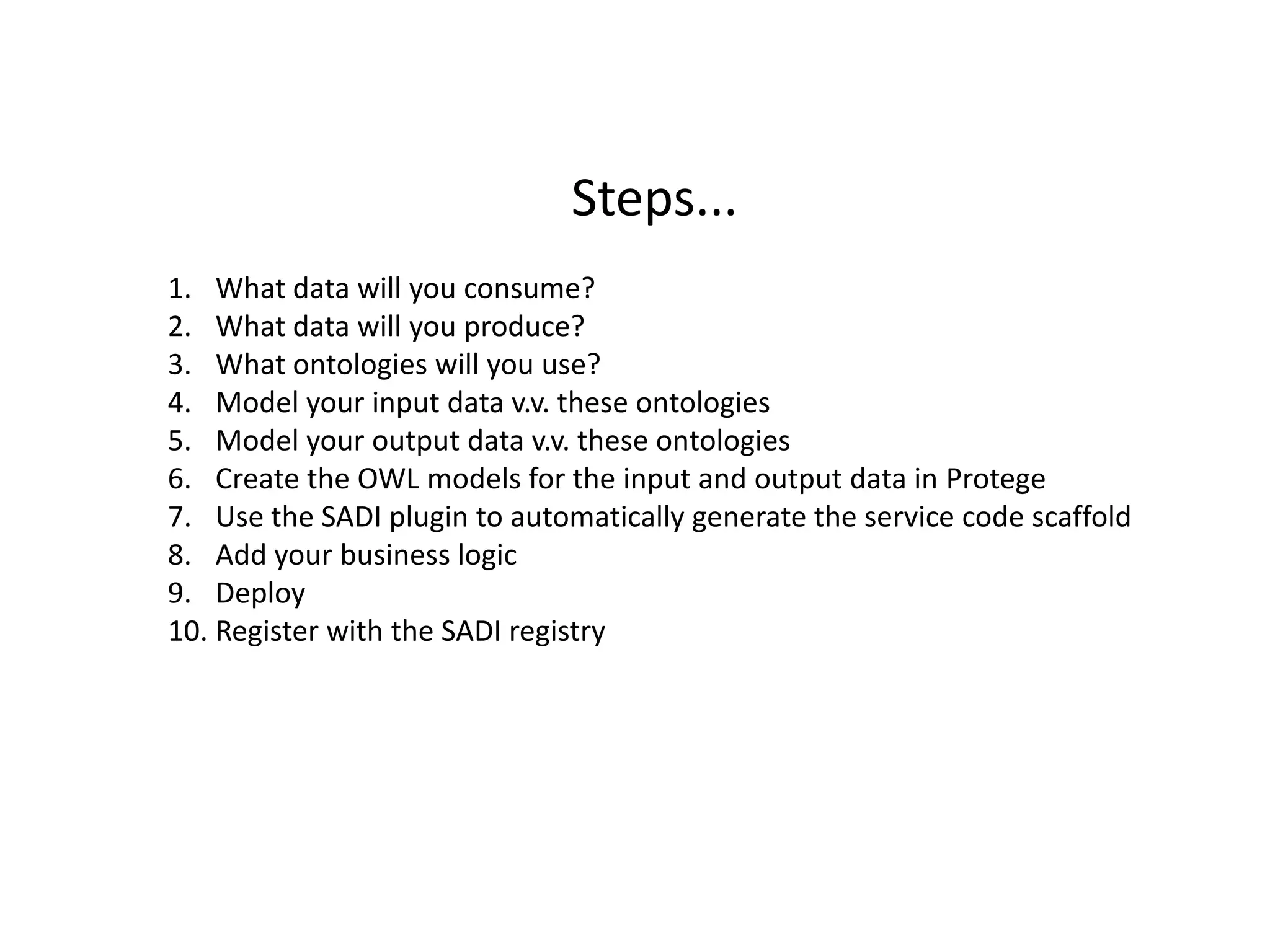 This document outlines the process of creating a SADI service in Perl using the Protege SADI plug-in, detailing steps from identifying data consumption and production to deploying the service. It includes specific instructions on modeling input and output data structures using ontologies, coding the service logic, and testing the service before registration. The example service described retrieves allele information from a genomic database based on specified gene loci.