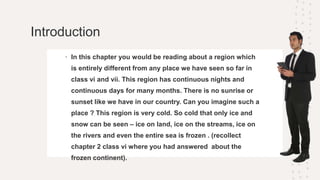 The document provides information about the polar region known as the Tundra. It describes the Tundra as a very cold region with continuous nights or days for many months. It has ice and snow covering land, streams, rivers, and seas. The indigenous people who live in the Tundra region are the Eskimos. They have adapted to the harsh climate by developing skills in hunting seals, fishing, and building shelters made of ice or animal skins. Their way of life depends on the extreme seasonal variations between long winters and short summers. Contact with outsiders beginning in the late 19th century introduced changes but also diseases that impacted the Eskimo populations.