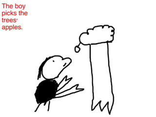 The boy picks apples from trees in the woods and plays with a tree every day, gathering its leaves to make crowns and play king of the forest. As the boy grows older, he visits the tree less often but the tree remains happy, giving everything to the boy. The story is about the relationship between the boy and the tree over time in the forest setting.