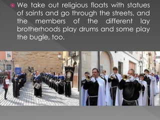 Miguel is a member of a brotherhood in Spain that celebrates Holy Week. His brotherhood parades religious floats and statues through the streets, with different brotherhoods playing drums and bugles. The people in Andalucia particularly fervently celebrate Holy Week and cry if the processions are cancelled due to rain. Miguel's brotherhood has one of the oldest and most expensive statues in Logroño, depicting Mary Magdalene from the 16th century.