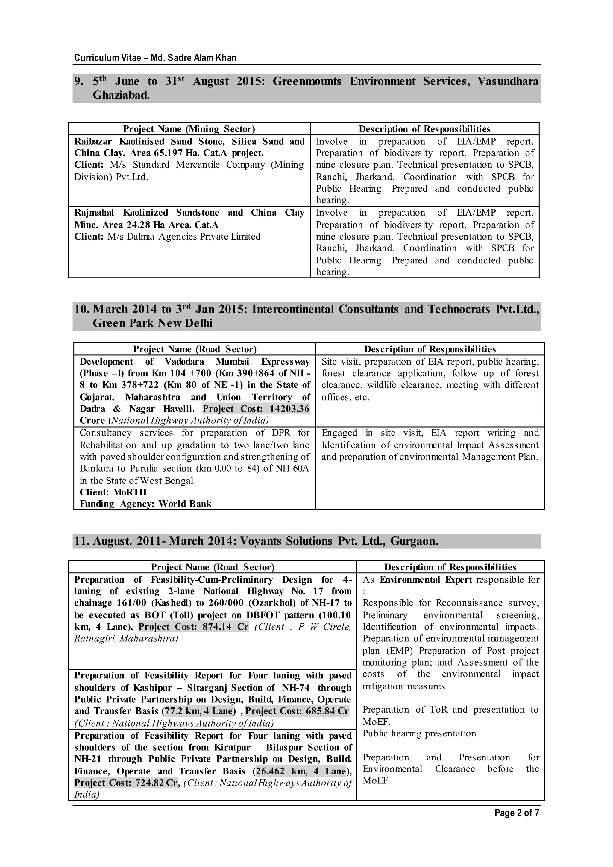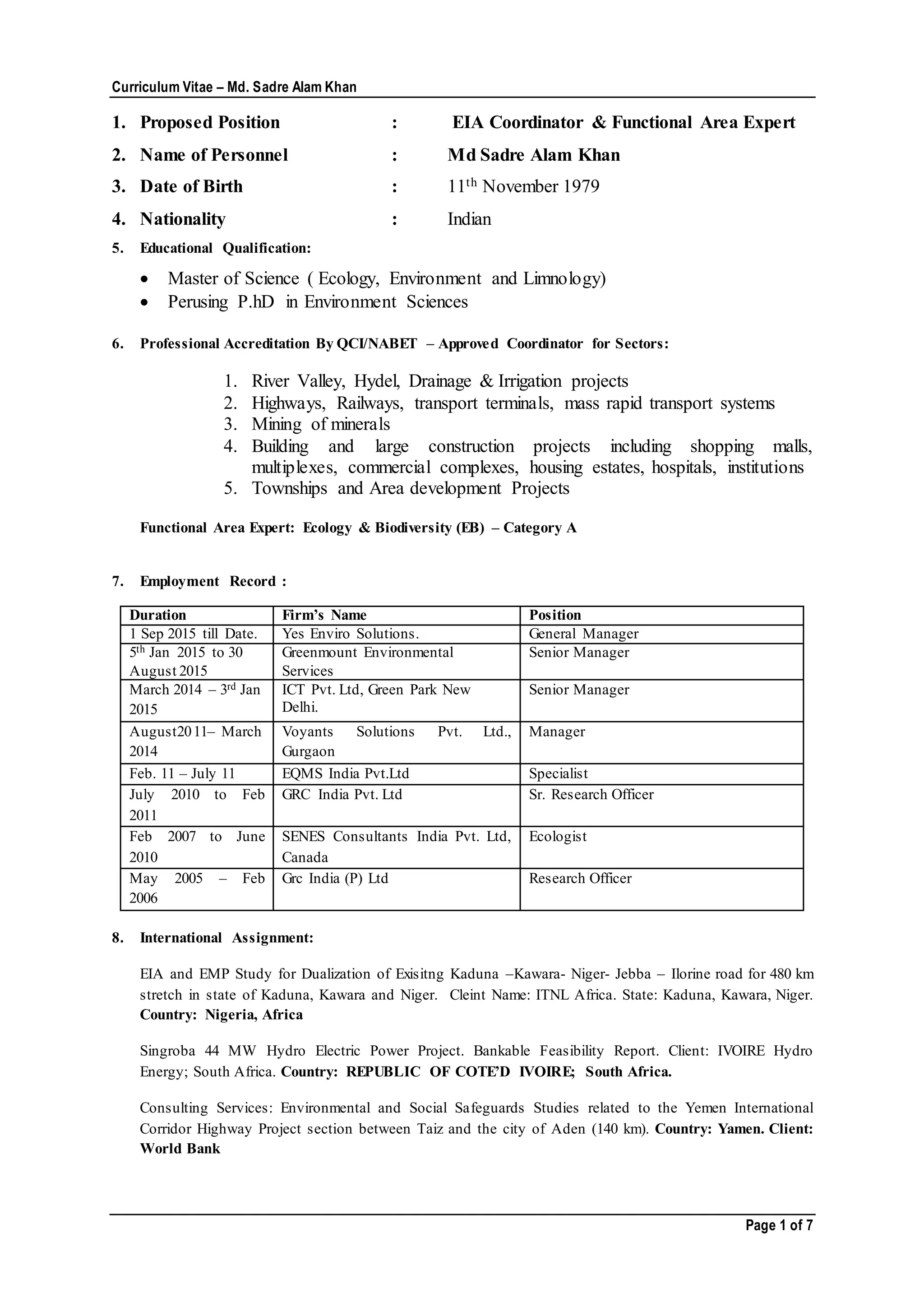 This document is a curriculum vitae for Md. Sadre Alam Khan that outlines his professional experience and qualifications. It describes his educational background in ecology, environment, and limnology as well as his professional accreditation as an EIA coordinator and functional area expert in ecology and biodiversity. The CV then details his employment history working on various EIA projects in sectors like roads, mining, municipal waste management, hydropower, and more. It provides examples of international projects he has worked on and responsibilities he has held in previous roles conducting environmental assessments.